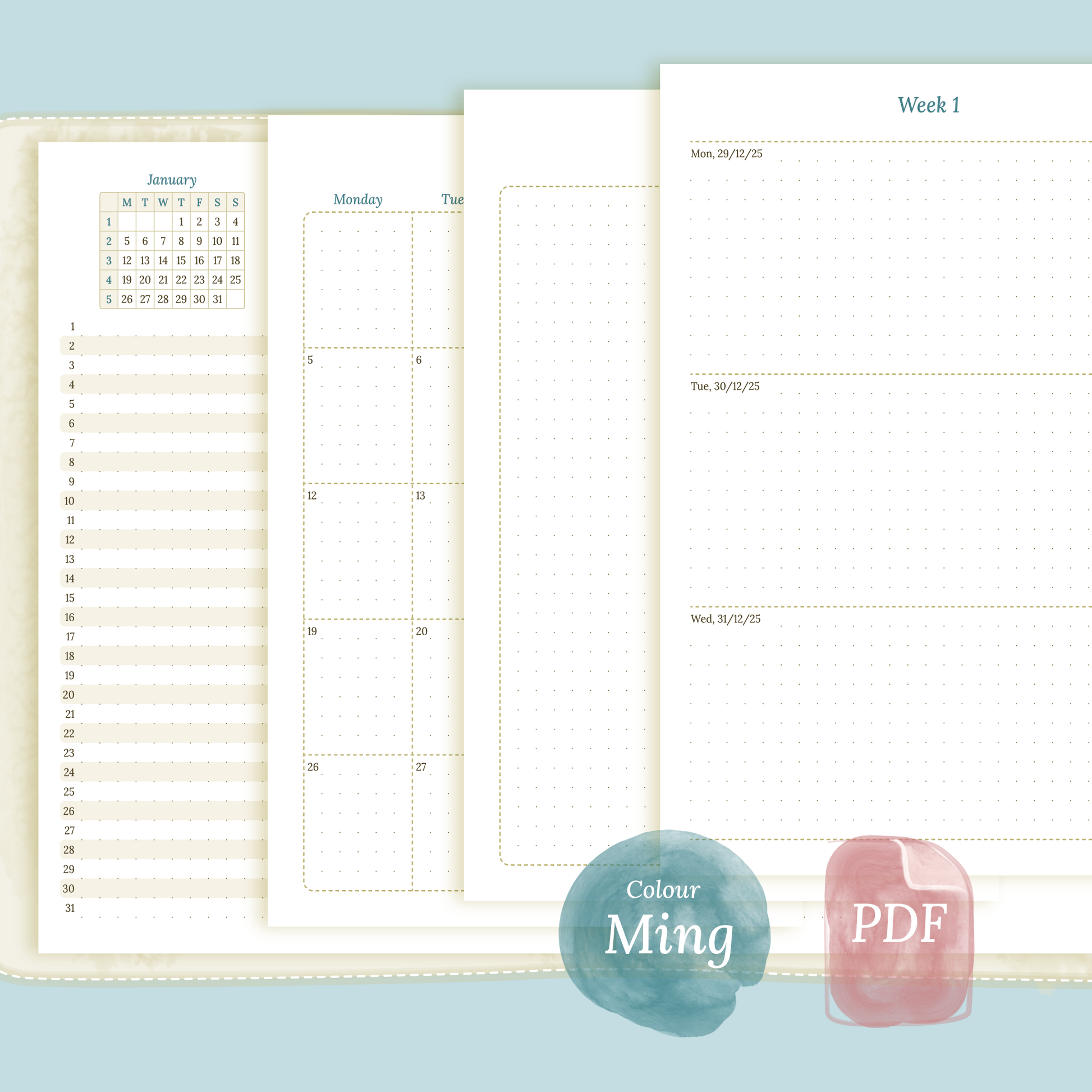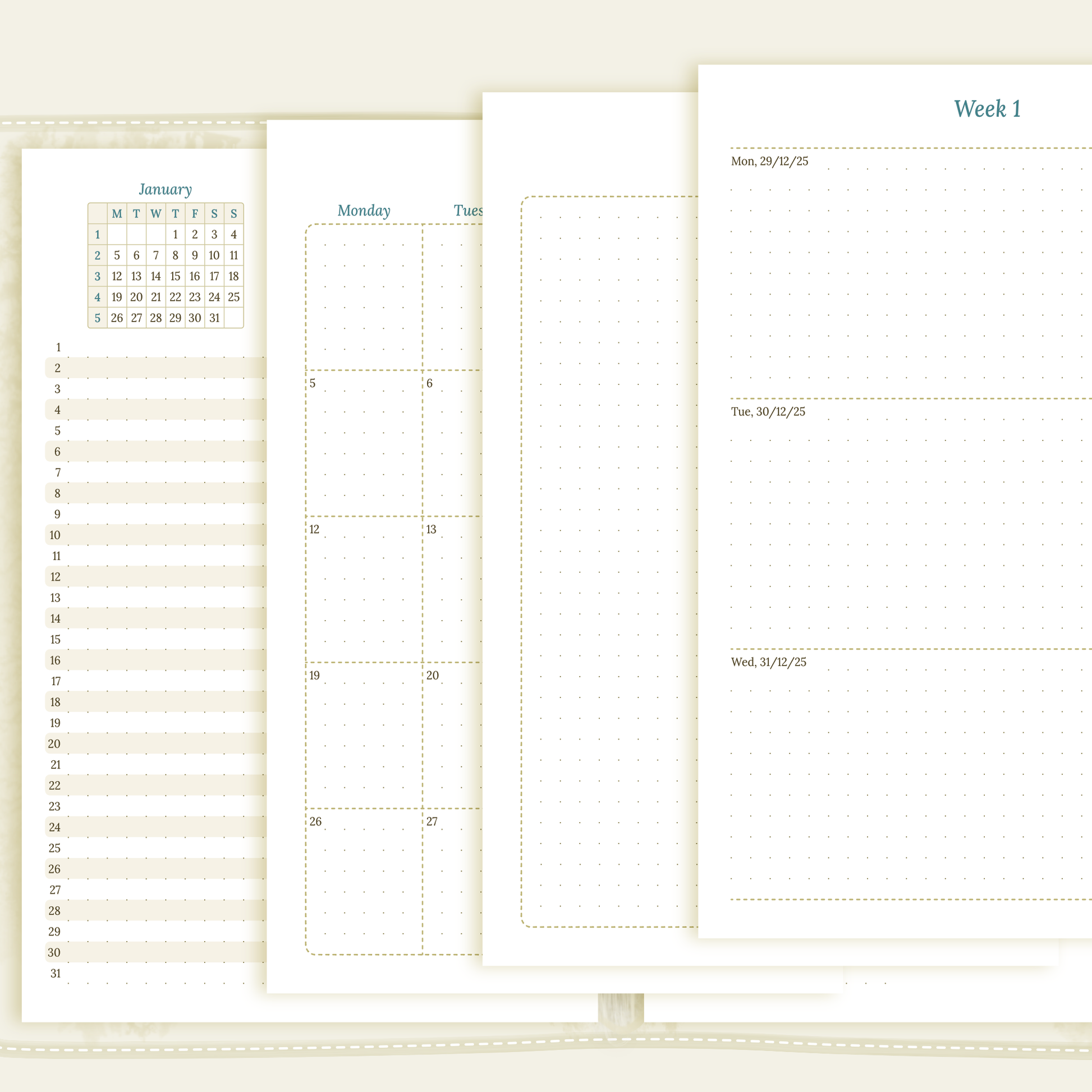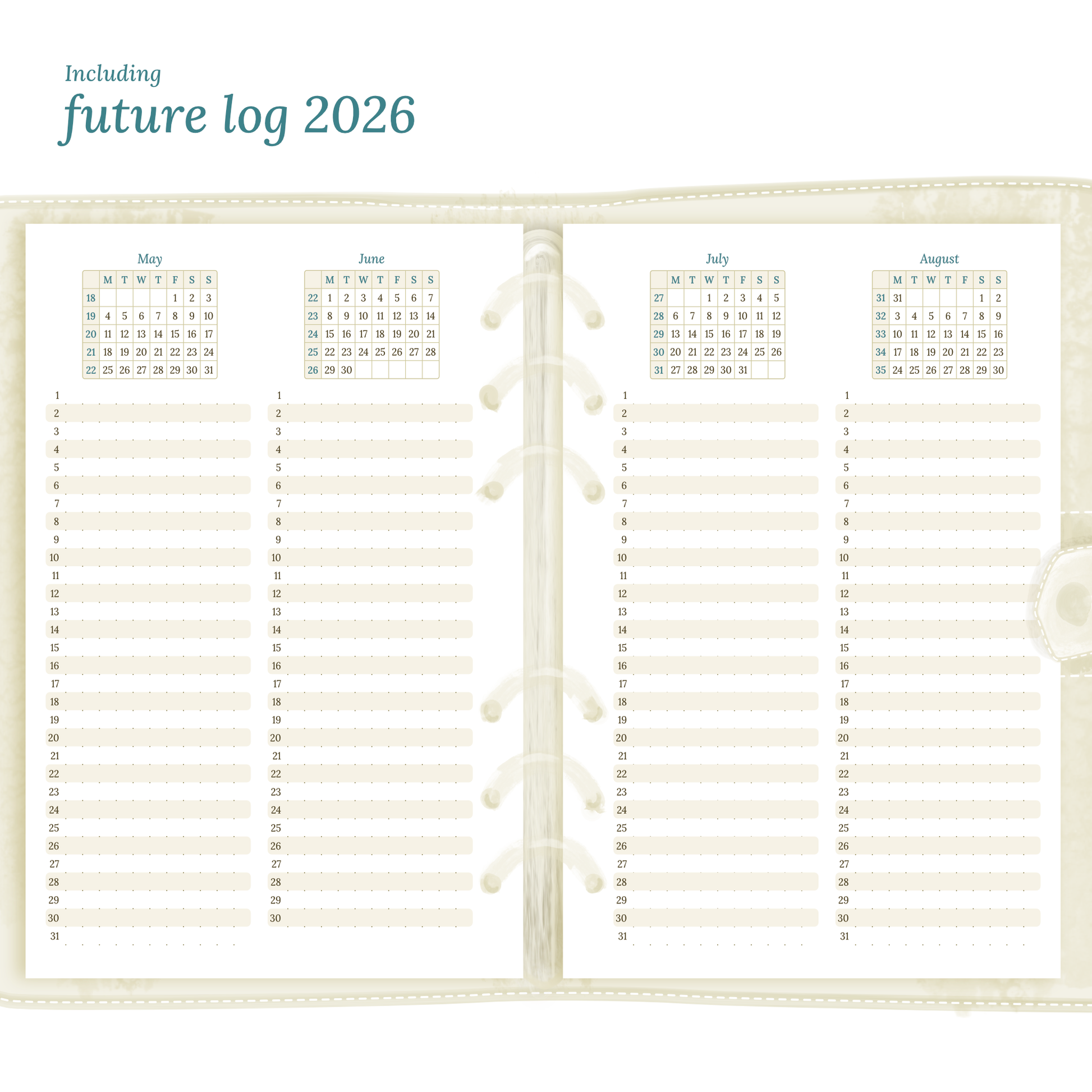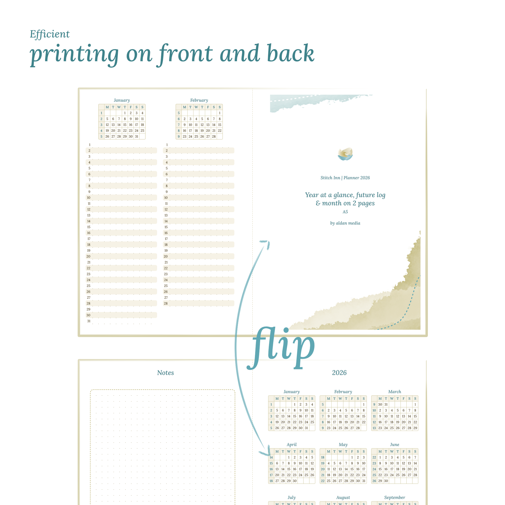 - Full year at a glance, future log, monthly & week on 2 pages planner 2026