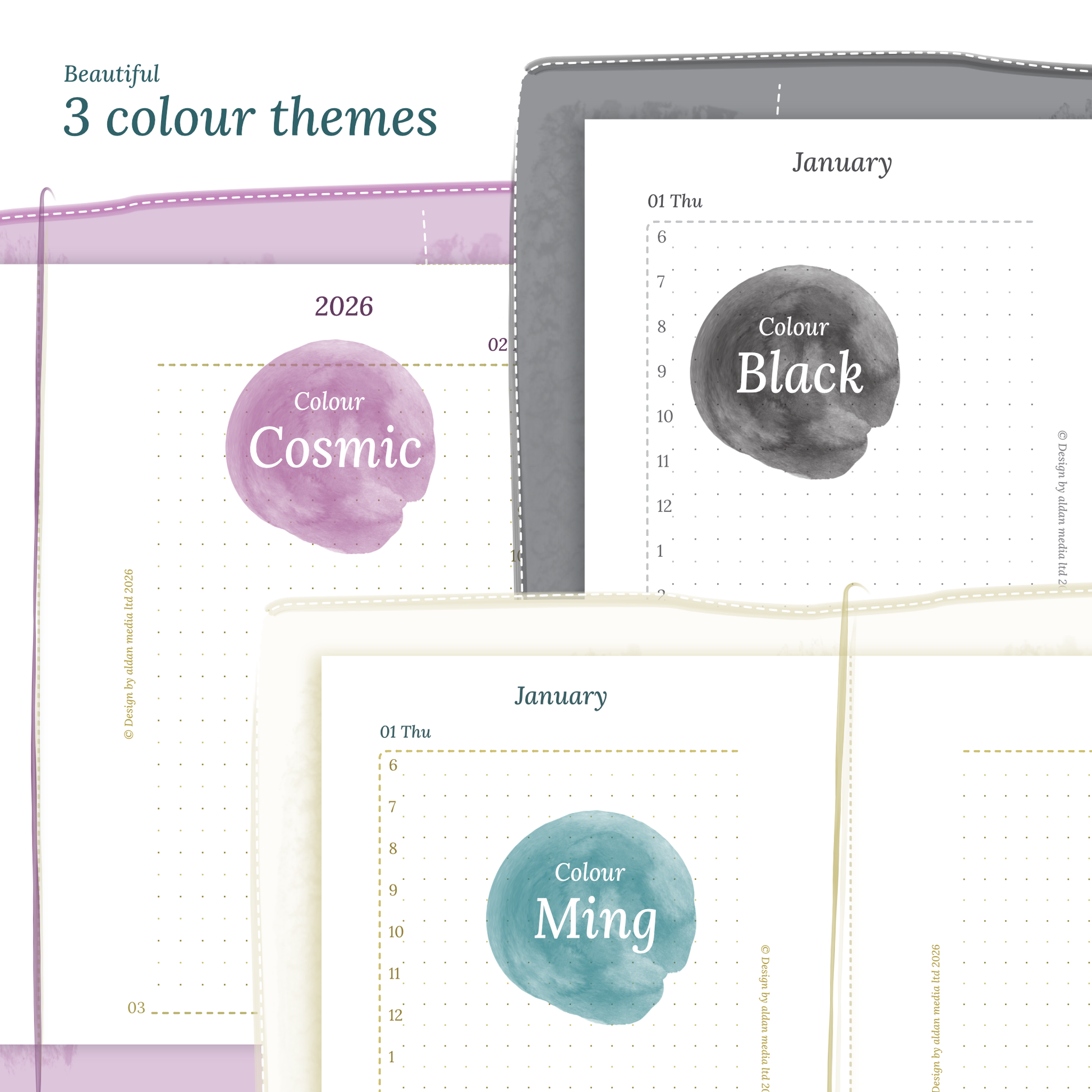 Choose from 3 different, carefully designed color themes to match your desired planner style.